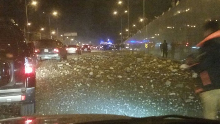Груженый камнями большегрузный автомобиль опрокинулся на бок, задев легковые автомобили. В районе ДТП перекрыто движение. Образовалась огромная пробка. Жертв нет, легкие травмы получил водитель грузовика.