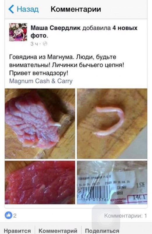 Отметим, что ранее снимки неприятной находки алматинка разместила на своей странице в Facebook. "Говядина из "Магнума"! Люди, будьте внимательны! Личинки бычьего цепня! Привет ветнадзору!", - написала покупательница в своем посте, приложив фото. Как пояснила жительницы Алматы Мария Свердлик, покупка была сделана 16 апреля в одном из супермаркетов популярной сети в Алматы.