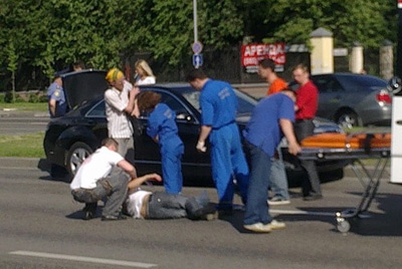 Пострадавший госпитализирован, у него диагностировали черепно-мозговую травму, ушибы. Mercedes представительского класса с номером А438МР97 ехал в сторону центра. По словам свидетелей, сразу после аварии водитель машины скрутил номера и снял мигалку.