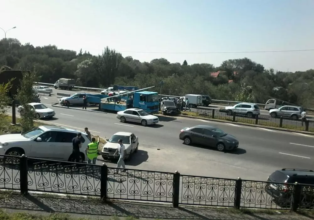 Крупное ДТП с участием шести автомобилей произошло на Восточной объездной автодороге (ВОАД) в Алматы, сообщает корреспондент программы "Территория происшествий" на телеканале СТВ.