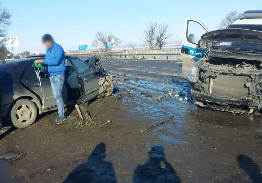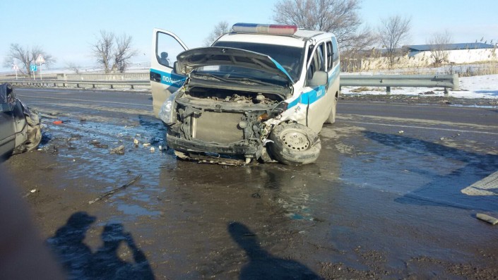 По данным полиции, авария произошла в воскресенье 27 декабря на 212-м километре автодороги Алматы - Ташкент. Как оказалось, 46-летний водитель легкового автомобиля Mercedes двигался со стороны села Кордай в Алматы. "В результате обгона впереди движущейся автомашины, не убедившись в безопасности маневрирования, он совершил столкновение с автомашиной Hyundai Н-1, то есть полицейским "Автоураганом", - говорится в сообщении.