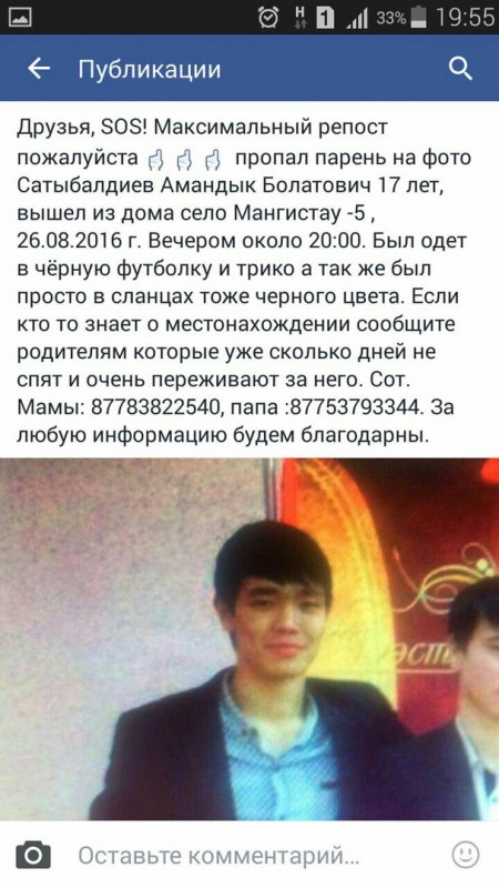 Родители просят всех, кто располагает какой-либо информацией о местонахождении Амандыка Сатыбалдиева, сообщать по телефонам: 8 778 382 2540 и 8 775 379 3344.