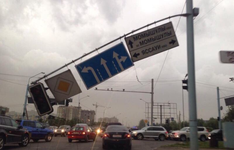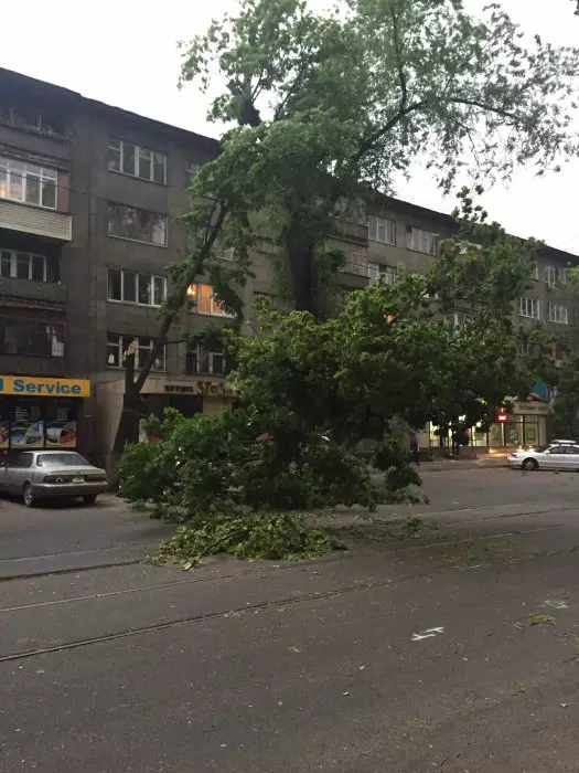 16 мая в Алматы наблюдались сильные порывы ветра. На некоторых улицах города были повалены деревья, оборваны линии электропередачи. В связи с непогодой в аэропорту Алматы также были задержаны некоторые рейсы.