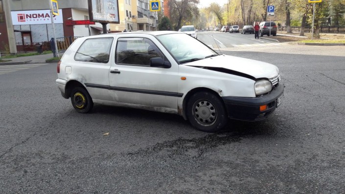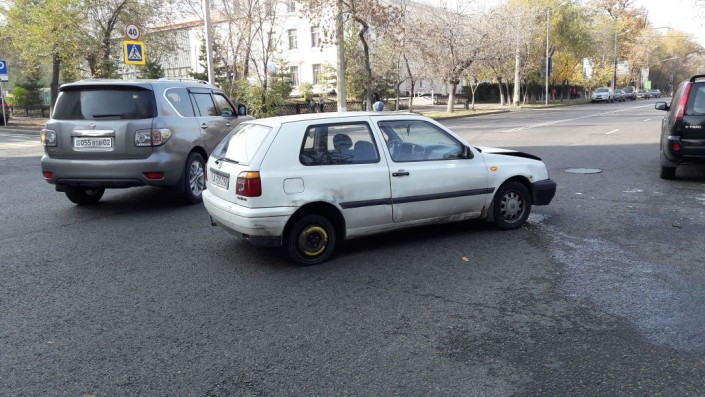Как сообщает корреспондент, ДТП произошло на пересечении улиц Толе би и Абдуллиных. Nissan Qashqai следовал по Абдуллиных в северном направлении, а Volkswagen Golf по Толе би в западном направлении. Qashqai проигнорировал знак "Уступи дорогу", проехал перекресток, Golf ударил его в бок. От удара Qashqai перевернулся, его откинуло на тротуар.
