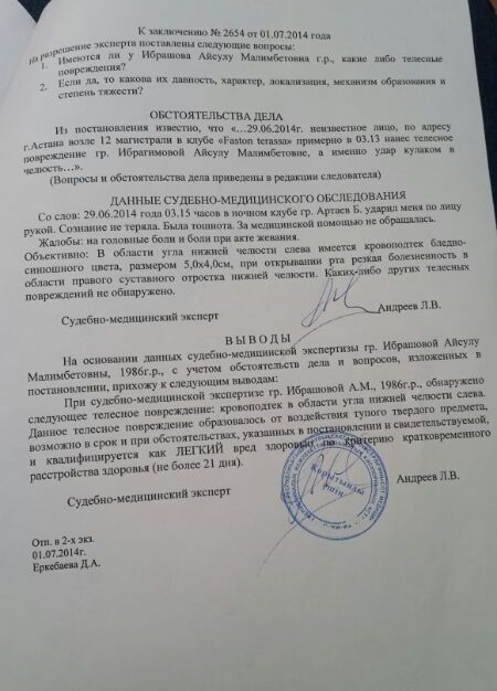 Жительнице Астаны Айсулу Ибрашовой передали результаты ее судебно-медицинской экспертизы по инциденту с участием олимпийского чемпиона по боксу Бахтияра Артаева, передает корреспондент Tengrinews.kz.
