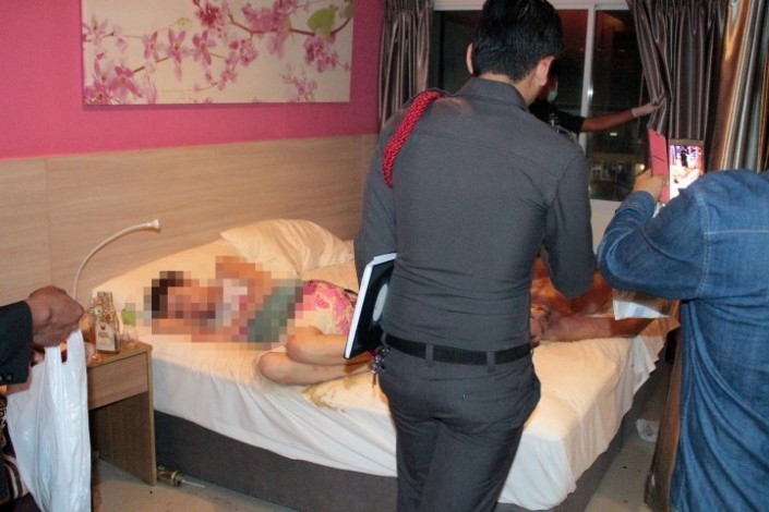 Сообщается, что, войдя внутрь, полицейские обнаружили в комнате обнаженное тело мужчины, рядом с которым на кровати "лежала девушка тайской национальности в сильном алкогольном опьянении". Она ничего не могла пояснить следователям, лишь только плакала.