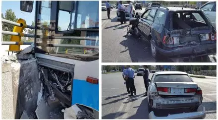После столкновения с Audi автобус пересек улицу Саина, снес разделительное ограждение, вылетел на встречную полосу движения, затем врезался в цветочную аллею, снеся бордюры. Затем, перелетев через арык, автобус врезался в опору моста развязки, едва не упав в тоннель.