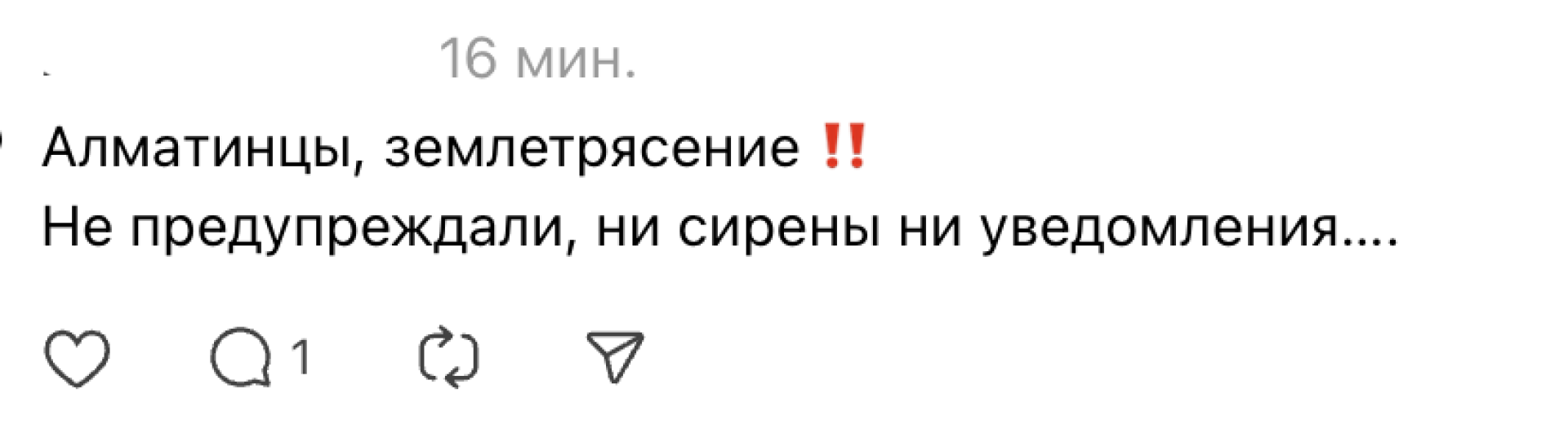 Как отмечают алматинцы в соцсетях, за сегодняшним землетрясением оповещение не последовало, не говоря уже о том, что оно должно приходить заранее.