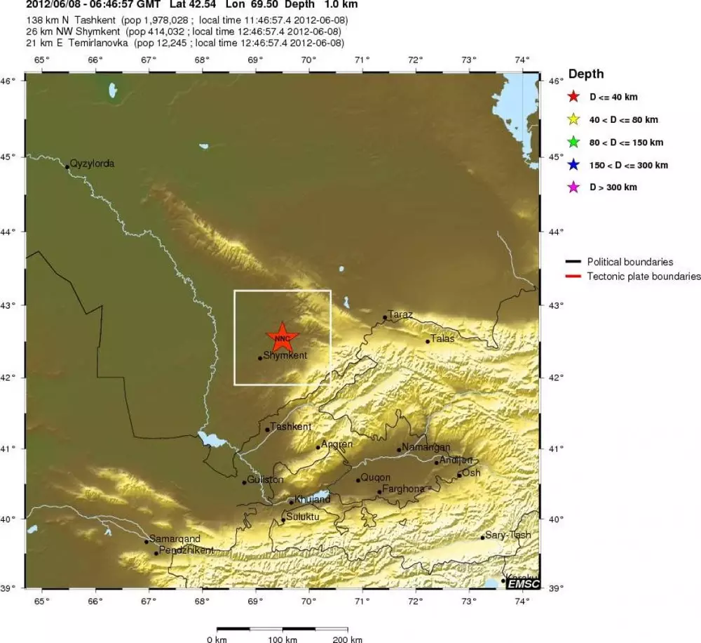 Эпицентр землетрясения находился в 26 километрах от Шымкента на глубине одного километра. Толчки были зафиксированы в 12. часов.46 минут по местному времени.