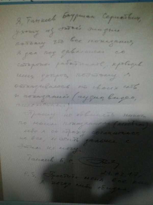 Как известно, в ночь с 20 на 21 февраля 2017 года Бауржан Танкеев повесился. Рядом с ним лежала предсмертная записка следующего содержания: "Я, Танкеев Бауржан Серикпаевич, ухожу из этой жизни, потому что все показания дал под давлением со стороны работников, проводивших допрос, поэтому я отказываюсь от своих слов и показаний (аудио, видео, письменных). Прошу никого не обвинять по моим показаниям (любыми). Ибо я со страху согласился на все и жить дальше с этим дальше не смогу. Танкеев Б.С. 21.02.2017. Простите меня все, кого я когда-либо обидел".