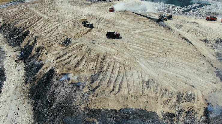 Всего с момента возникновения пожара спасатели завезли на полигон свыше 25 тысяч кубометров грунта и 5,5 тысячи кубометров воды. Для тушения труднодоступных очагов был привлечен вертолет Ми-8 с водосливным устройством.