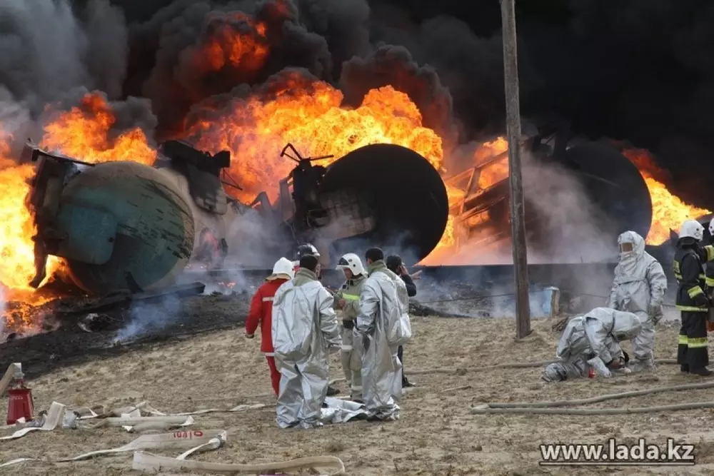 После этого загорелись нефтяные цистерны. Сообщается, что помощник машиниста умер в реанимационном отделении Мангистауской областной больницы. По предварительным данным, сам машинист погиб на месте.