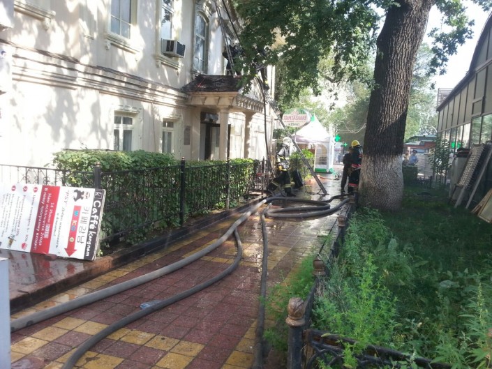 Сообщение от очевидца о горении кровли по адресу: улица Панфилова, 99 ОФ "Международный фонд Д.А.Кунаева" поступило на пульт "101" 07.49 утра. Известно, что здание 1860 года постройки. Первые пожарные подразделения прибыли к месту вызова уже через 4 минуты.
