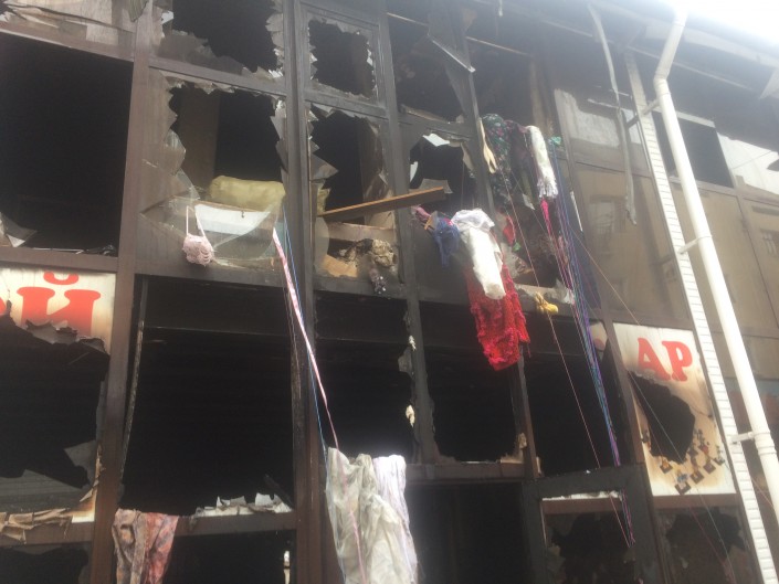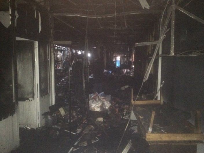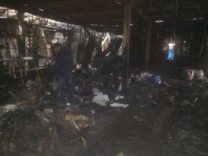 По данным ДЧС Жамбылской области, увеличению площади пожара и распространению огня способствовала высокая пожарная нагрузка и конструкции бутиков, исполненных из легковоспламеняющихся строительных материалов.