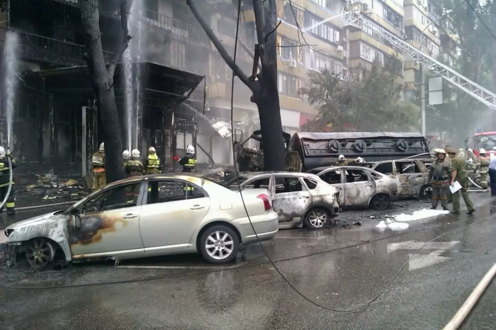 Пожар возле отеля Rixos в Алматы, произошедший после взрыва бензовоза, ликвидирован, передает корреспондент Tengrinews.kz с места события. В ликвидации огня были задействованы 350 человек, 14 пожарных машин, 40 единиц техники. Пожару была присвоена вторая категория опасности. Его площадь, по предварительным данным, составила не менее 400 квадратных метров. Из 40 квартир дома, на который перекинулся огонь, пострадали 20 квартир. Все жители живы, травмированных нет, сказал аким Алмалинского района Алматы Серик Кусаинов. Сгоревшие машины, которые были припаркованы возле места происшествия, отправят на городскую стоянку, где проведут следственные мероприятия, после чего решат вопрос о компенсации. Жильцов дома разместят в близлежащей школе, для них организовано питание, установлены палатки. С ними работают психологи и медики. Сейчас дорожная полиция выясняет, имел ли право бензовоз проезжать по маршруту. Проверят также техническое состояние грузовика, назначены следственные мероприятия. Напомним, бензовоз взорвался утром 27 июня на пересечении проспекта Сейфуллина и улицы Кабанбай батыра. Водитель машины погиб. Огонь перекинулся на многоэтажный дом по адресу: улица Кабанбай батыра, 138.