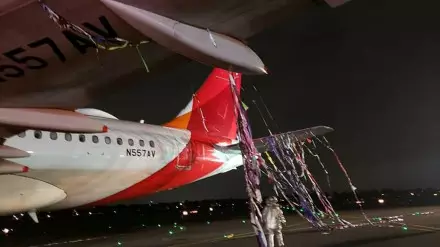 Судя по видео очевидцев, самолет оказался весь опутан новогодними праздничными украшениями.