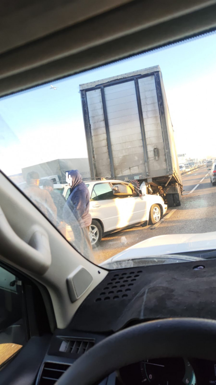 В редакцию прислали фото с места ДТП. По словам очевидцев, авария произошла утром 25 декабря на проспекте Рыскулова. Прицеп грузового автомобиля отцепился и вылетел на встречку.