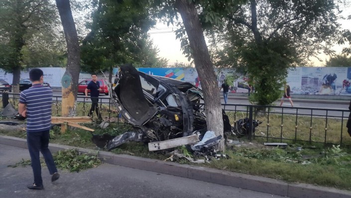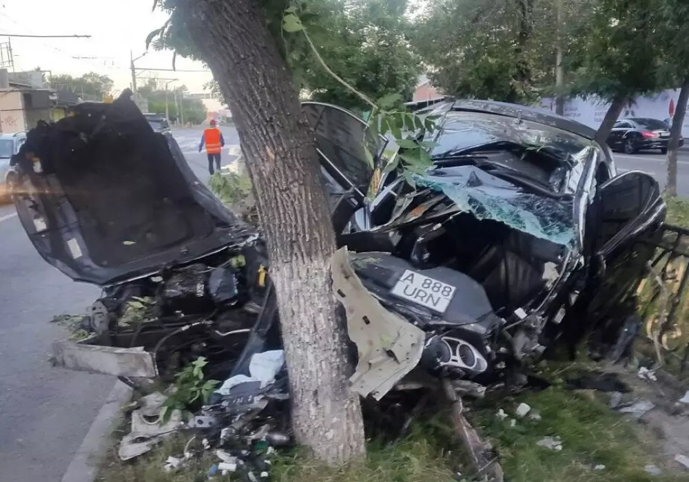 Автомобиль марки Lexus IS 350 следовал по проспекту Абая в восточном направлении. На углу с улицей Тургут озала водитель автомобиля не справился с управлением и допустил наезд на бордюр, в результате чего пробил колесо, вылетел на разделительный газон и сбил два дерева.