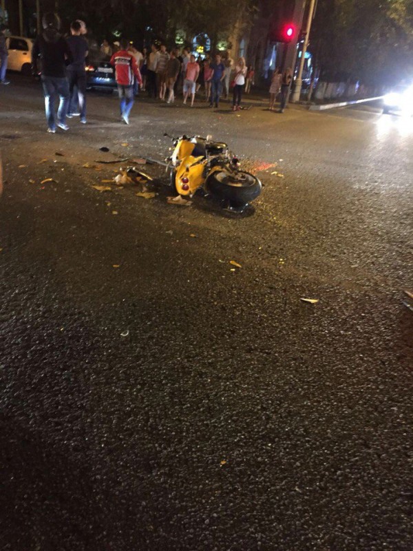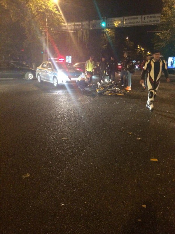 По словам очевидцев, мотоциклист ехал по Фурманова, пересекая улицу Толе-би на зеленый сигнал светофора в южном направлении. В этот момент водитель автомобиля Lexus, проигнорировав красный сигнал светофора, совершил поворот с Толе-би и допустил столкновение с мотоциклистом. Мотоциклист въехал в правую заднюю дверь легковушки. От сильного удара байкер пролетел несколько метров и ударился об асфальт. Некоторое время он лежал без сознания, а затем очнулся, но не мог разговаривать и отвечать на вопросы. Позже приехала скорая помощь и отвезла пострадавшего в больницу. Он получил порез шеи, перелом ноги и ребра. В настоящее время его готовят к операции.