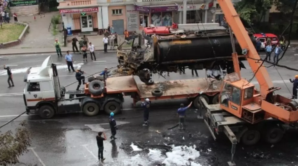 "В сгоревшем бензовозе было неисправным рулевое управление и отсутствовал привод вспомогательной тормозной системы (выполняет функцию, идентичную функции горного тормоза, - не дает машине развить скорость более 40 километров в час)", - говорится в сообщении, распространенном в четверг, 8 августа.