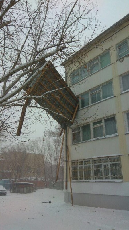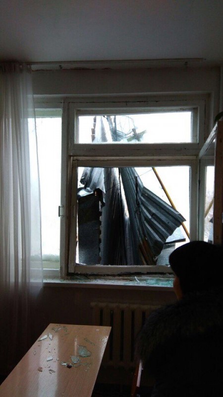 Как видно на фотографиях, представленных читателем портала, часть слетевшей кровли разбила одно из окон здания.