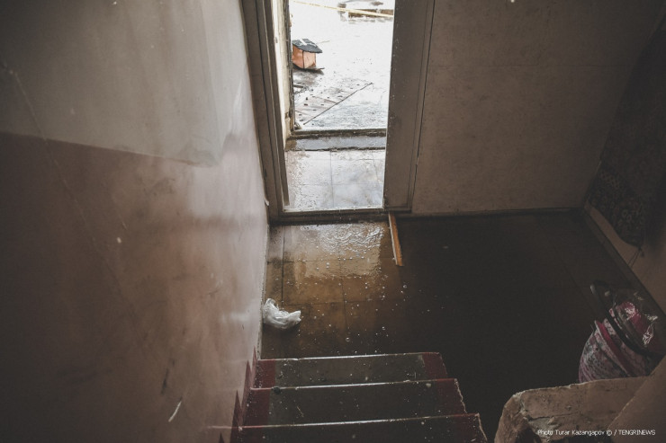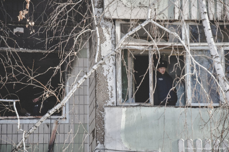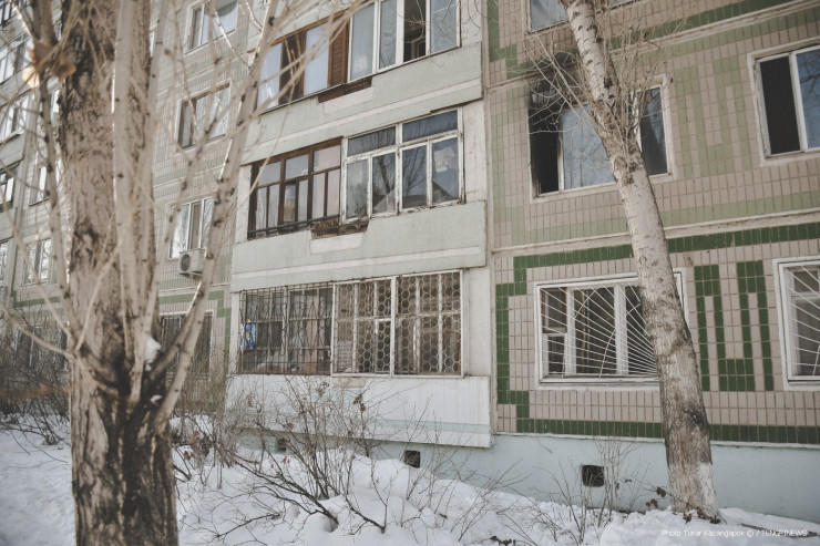 Дом на улице Куйши Дина - 1989 года постройки. Жители, собравшиеся во дворе, рассказали, что пожар был сильным из-за газа: дом подключен к центральному газоснабжению.