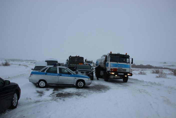 В результате сложных метеорологических условий - метель, сильный ветер, гололед - на автодороге "Алматы - Екатеринбург" на участке "Караганды - Аксу - Аюлы" произошло большое скопление грузового, легкового и пассажирского автотранспорта, следовавшего в направлении Караганды и Алматы.