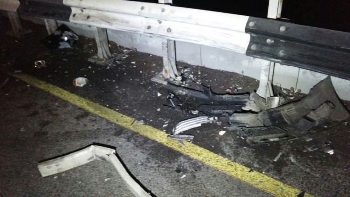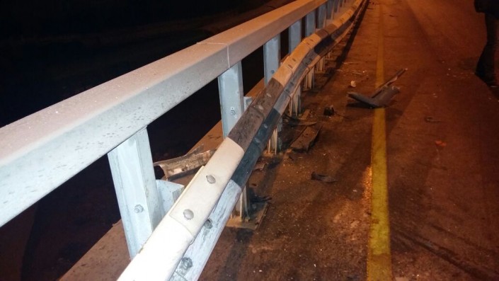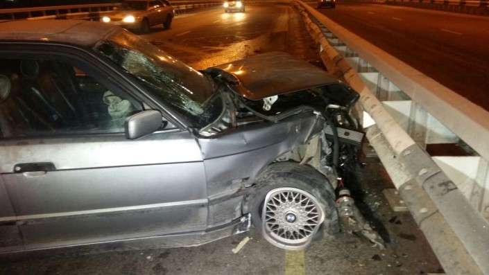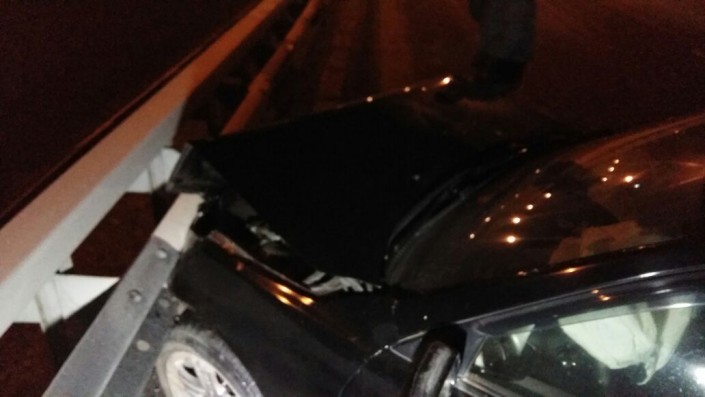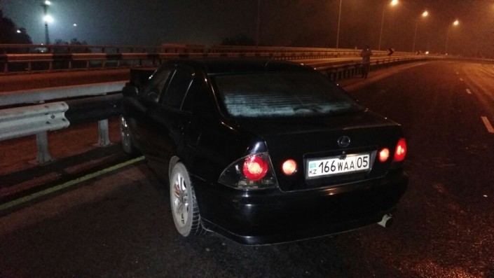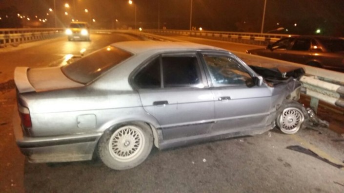 На развязке по проспекту Суюнбая на юг, не доезжая улицы Шолохова, автомобиль марки BMW совершил наезд на препятствие (металлическое ограждение моста). После этого машину откинуло и она встала поперек дороги.