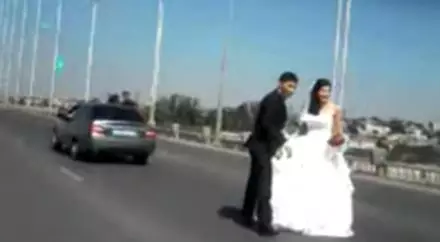 Пока новобрачные занимались съемкой свадебного ролика, на дороге образовалась огромная пробка. Один из возмущенных водителей запечатлел инцидент на камеру мобильного телефона.