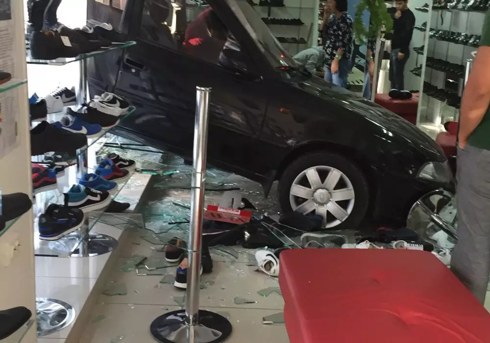 Автомобиль Nexia накануне въехал в цокольный этаж обувного магазина "Канны". Инцидент произошел по улице Байтурсынова. Водитель умудрился пролететь через тротуар и въехать прямо в стеклянную витрину, которая разлетелась вдребезги. Повреждена и часть товара. В момент неудачной парковки в торговом зале находились покупатели и сотрудники магазина. О пострадавших пока не сообщается.