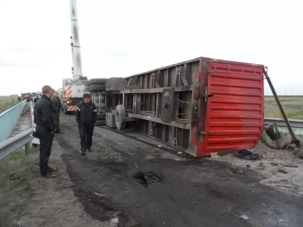 На трассе Алматы - Екатеринбург в Аршалынском районе Акмолинской области перевернулся и заблокировал дорогу грузовик с прицепом, сообщается в пресс-релизе ДЧС области. Согласно пресс-релизу ведомства, водитель грузового автомобиля, в прицепе которого перевозилось около 40 тонн шамотной глины, уснул за рулем и, потеряв управление, врезался в бетонное ограждение моста. В результате столкновения машина перевернулась и полностью заблокировала дорогу, из-за этого на 1349-м километре трассы образовался затор из 250 автомобилей. Из бензобака автомобиля произошла утечка дизельного топлива, возникла угроза воспламенения. Сотрудникам МЧС удалось смыть с дороги топливо и поставить перевернувшийся грузовик на колеса при помощи автокрана. Движение на трассе было полностью восстановлено. О пострадавших и погибших в результате дорожно-транспортного происшествия не сообщается.