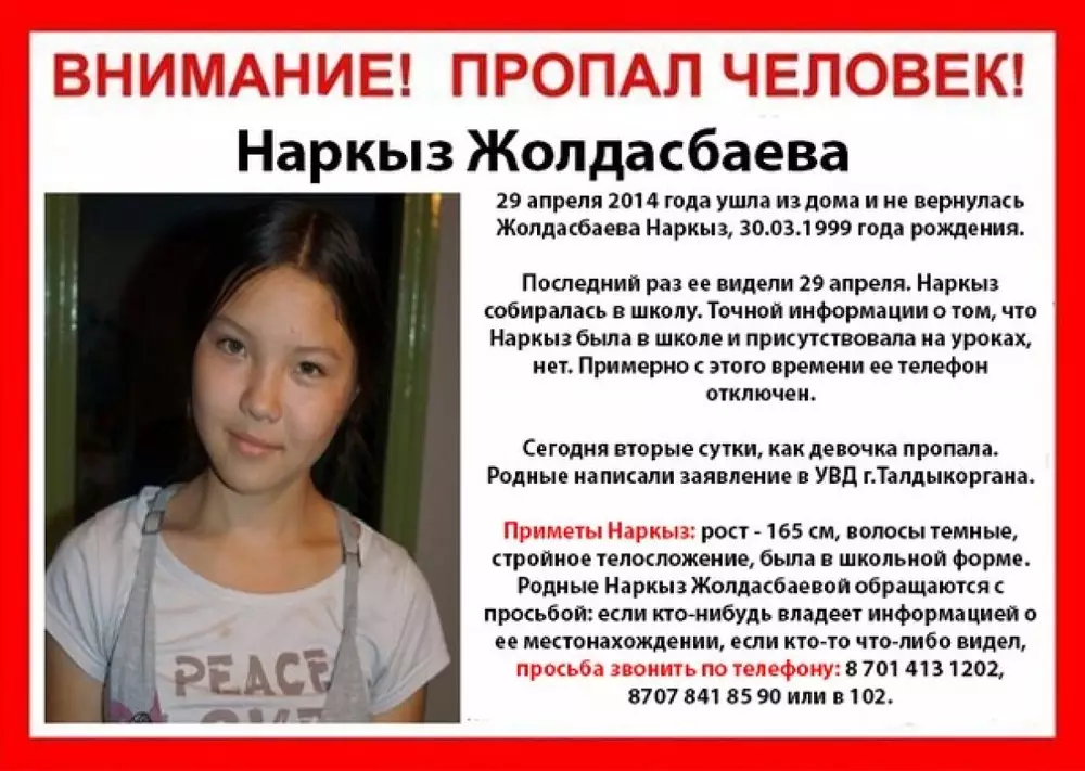 15-летние Наркыз Жолдасбаева и Айдана Кожебаева ушли из дома 29 апреля 2014 года. Девочки учатся в одной школе, после уроков они ушли вместе и с тех пор их не видели. Сотовые телефоны у них отключены.