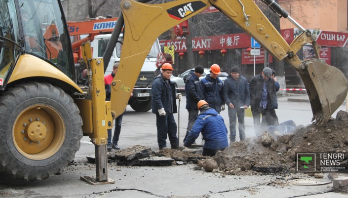 Как сообщает корреспондент Tengrinews.kz, на месте работают около 10 рабочих. Они роют траншею, чтобы устранить прорыв.