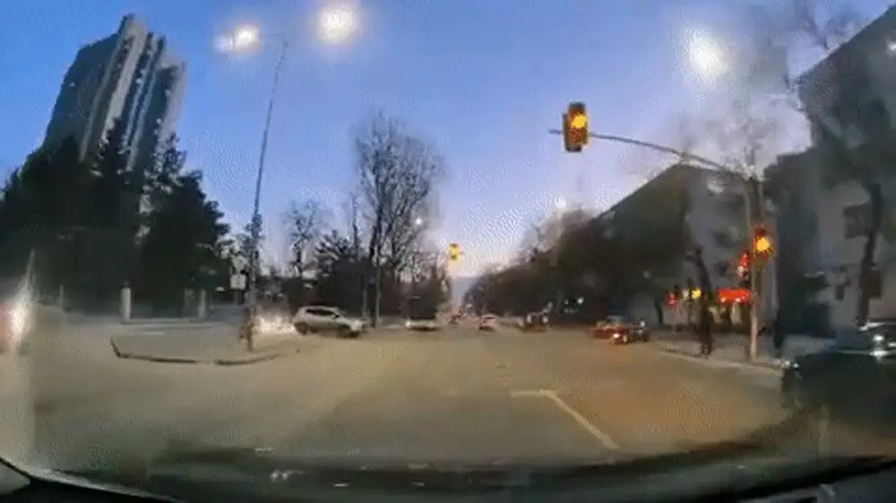 Пассажирский автобус в Астане, следовавший на полном ходу, едва не столкнулся с кроссовером. Опасный момент на дороге попал в объектив видеорегистратора, передает корреспондент Tengrinews.kz.