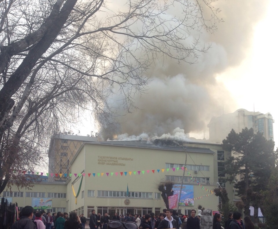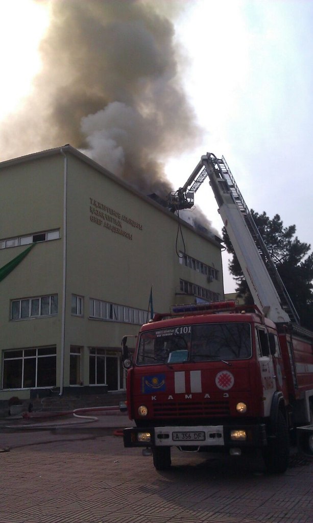 Студенты и преподаватели эвакуированы. На место происшествия прибыли пожарные расчеты. По данным программы "Территория происшествий" на телеканале СТВ, площадь пожара составила более тысячи квадратных метров. Загорелся четвертый этаж, где находится факультет кинорежиссуры. Студенты рассказали, что сегодня занятий не было, в заведении праздновали Наурыз, поэтому учащиеся находились в здании. По предварительным данным, причиной пожара могло стать короткое замыкание.