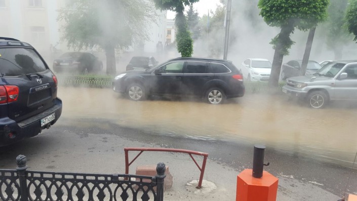 По словам очевидца, прорыв на перекрестке Айтеке би - Абылай хана произошел примерно в 12.15. Вода стремительно топит перекресток, из-за пара в этом районе образовался туман. Стоит добавить, что на этом месте расположен паркинг. Автовладельцы спешно отгоняют свои машины.