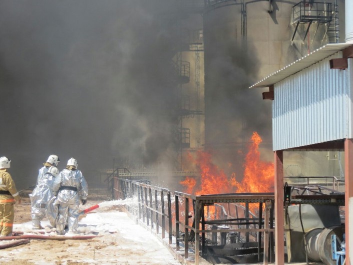 Пожарные проводят пенную атаку для тушения пожара на нефтебазе. Пенная атака производится одновременно всеми расчетными средствами. "Подготовка к пенной атаке проводится в максимально короткий промежуток времени, так как горение и выделяемая температура оказывает значительное влияние на тушение пожара пеной. Кроме того, увеличение времени горения повышает опасность распространения пожара на соседние резервуары, а также опасность вскипания и выброса нефти и других темных нефтепродуктов", - сообщил официальный представитель КЧС МВД РК Руслан Иманкулов.