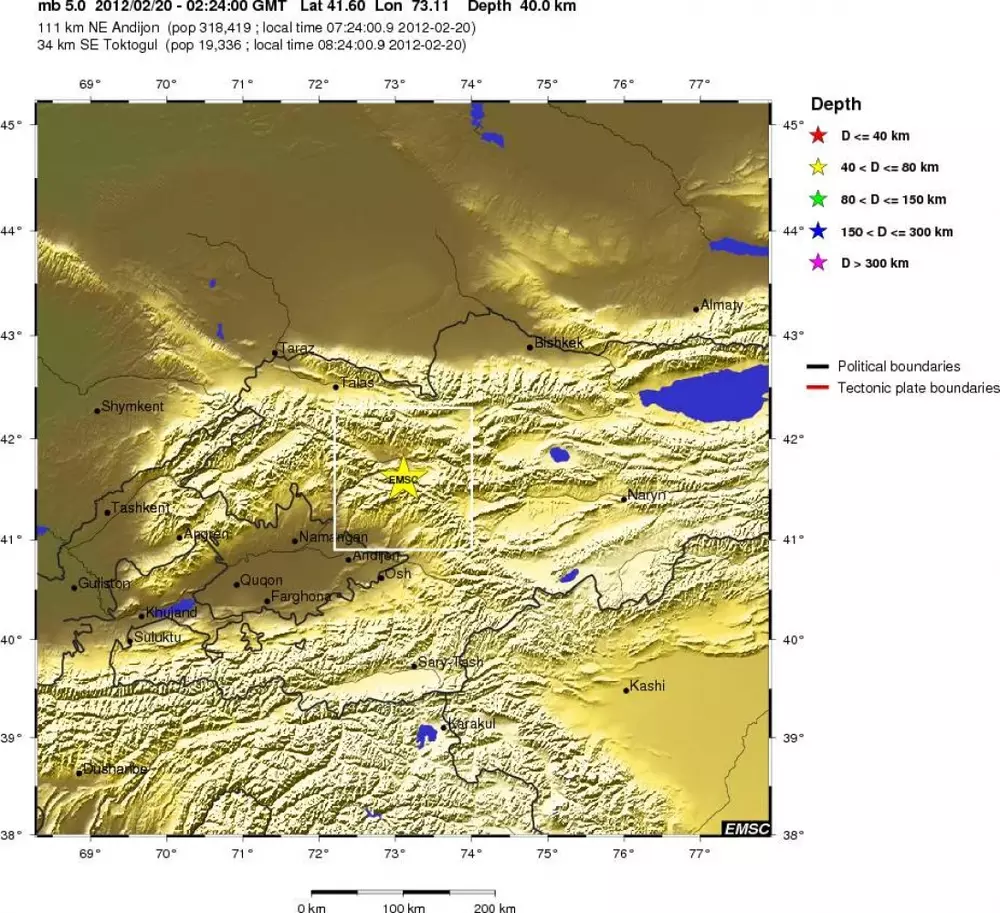 Подземные толчки были зафиксированы 20 февраля в 02.24. Эпицентр землетрясения находился в 111 километрах к северо-востоку от узбекистанского Андижана и в 34 километрах к юго-востоку от Токтогула (Кыргызстан) на глубине 40 километров. Информации о жертвах и разрушениях нет.