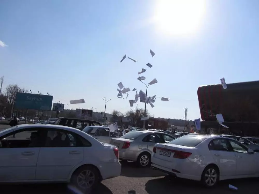 Молодые ребята разбросали листовки возле торгового центра "Мегапланет", а также расклеили номера оппозиционной газеты "Эркин Юрт" на стекла такси и других автомашин возле торгового центра.