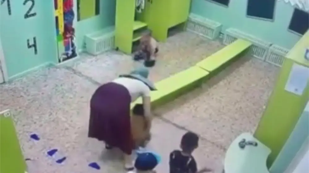Родители опубликовали в социальных сетях видео. На кадрах видно воспитателя в шляпе и детей. Сотрудница детского сада одевает одного ребенка, затем берет другого, ребенок садится на колени, воспитатель пытается его поднять, тот снова падает. Заканчивается видео тем, что женщина обнимает ребенка.