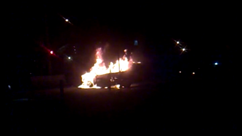 В Алматы после столкновения полностью сгорел автомобиль. Как сообщили корреспонденты программы "Полицейский патруль" телеканала СТВ, инцидент произошел в начале первого ночи на проспекте Райымбека, возле жилого комплекса "Акселькент".