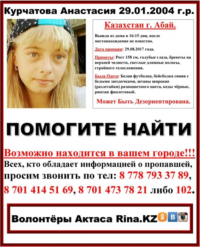 В городе Абай Карагандинской области вторые сутки ищут пропавшую школьницу Анастасию Курчатову 2004 года рождения. Девочка ушла из дома 29 августа примерно в 17.00, с тех пор о ней ничего не известно, передает корреспондент Tengrinews.kz.