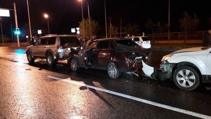 Массовое ДТП произошло по проспекту Рыскулова, не доезжая до улицы Шарипова. По словам очевидцев, водитель Subaru двигался в западном направлении. Он не справился с управлением и протаранил машины "Лада" и Mitsubishi Montero, стоявшие на светофоре.