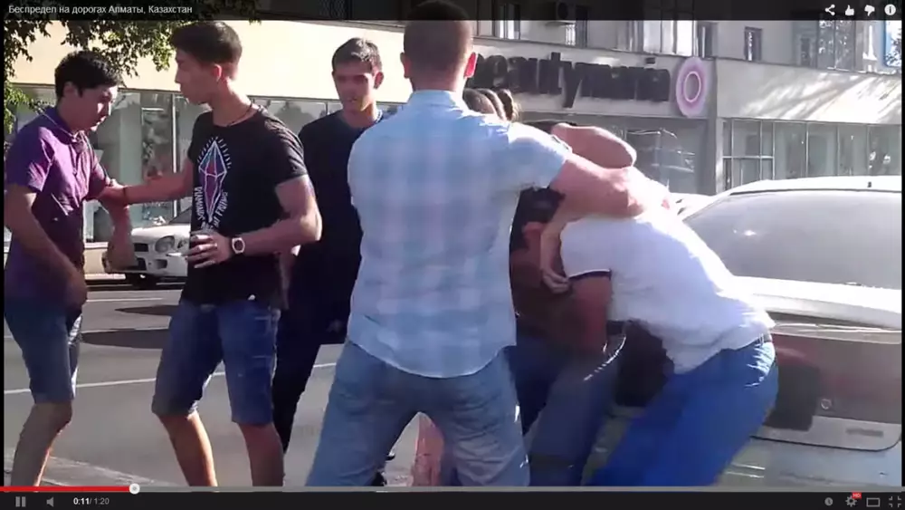 В центре Алматы на одном из перекрестков произошла драка водителей. Как сообщает очевидец, выложивший видеоролик на сайт YouТube, двое парней из автомобиля Mazda сначала обматерили беременную женщину за рулем, затем вытащили из машины ее мужа и начали его избивать. Беременная женщина не осталась в стороне и бросилась отбивать супруга. Затем в драку вмешались прохожие. Потасовка закончилась довольно быстро и без серьезных последствий.