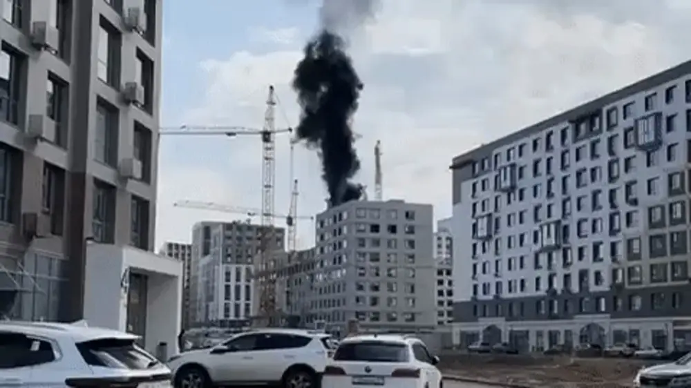 На территории строящейся многоэтажки по улице Мухамедханова, 4В, виден столб черного дыма. Видны языки пламени.