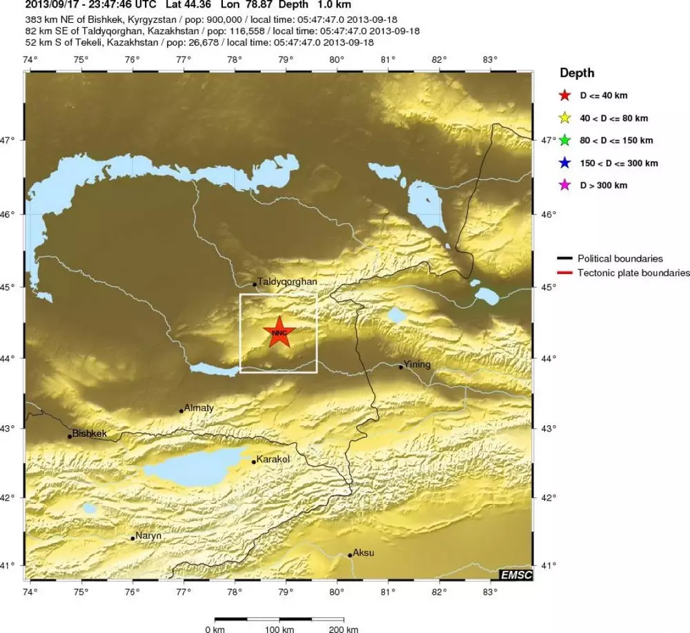 По данным Европейского сейсмологического центра, магнитуда землетрясения составила 3,5. Эпицентр находился в 82 километрах на северо-восток Талдыкоргана и в 52 километрах к северу от Текели.