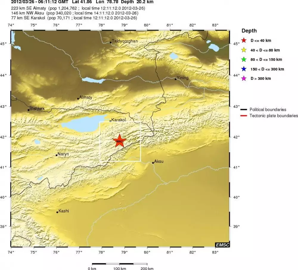 Подземные толчки были зафиксированы 26 марта в 12.11 по времени Астаны. Эпицентр землетрясения находился на глубине 20 километров в 223 километрах к юго-востоку от Алматы и в 77 километрах от кыргызского города Каракол. Информации о жертвах и разрушениях нет.