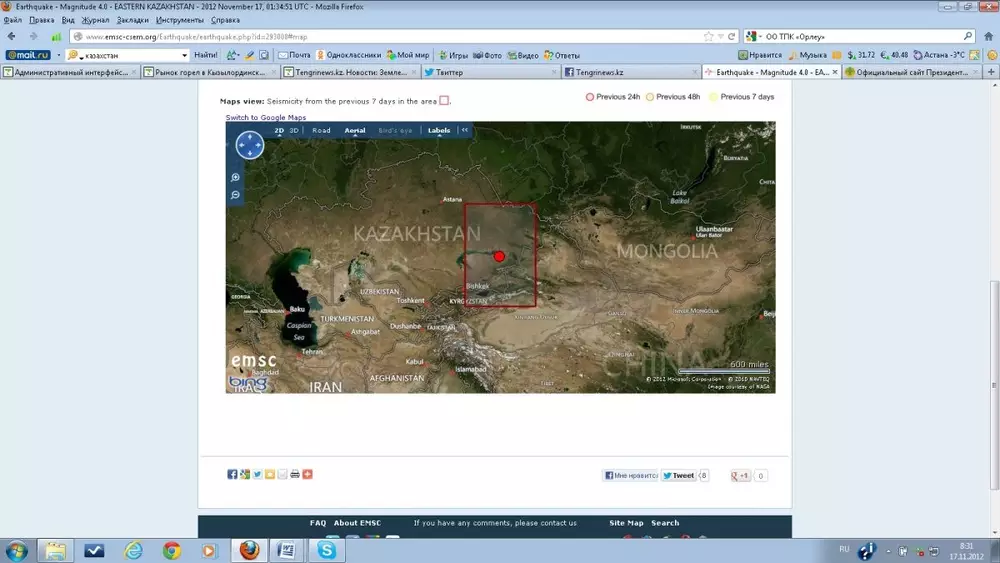 В Восточном Казахстане 17 ноября в 07.34 по времени Астаны произошло землетрясение магнитудой 4,0, передает корреспондент Tengrinews.kz со ссылкой на Европейско-Средиземноморский сейсмологический центр.