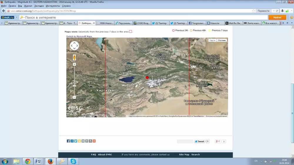 Землетрясение магнитудой 4,1 произошло 16 января в 18.21 по времени Астаны в 227 километрах от Алматы, передает корреспондент Tengrinews.kz со ссылкой на Европейско-Средиземноморский сейсмологический центр. Очаг подземных толчков зафиксирован на глубине одного километра. Эпицентр землетрясения располагался в Восточном Казахстане, в 227 километрах к востоку от Алматы, в 99 километрах к востоку от Караколя (Кыргызстан) и в 55 километрах к юго-востоку от Кегена (Казахстан). Казахстанский национальный центр данных приводит уточненные данные: эпицентр землетрясения располагался в 230 километрах от Алматы, его энергетический класс - 8,7. Информации о жертвах и разрушениях нет. 7 января землетрясение магнитудой 4,2 произошло в 152 километрах от Алматы, в районе озера Иссык-Куль.