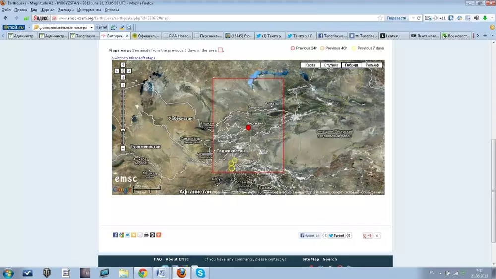 На территории Кыргызстана 21 июня в 05.05 по времени Астаны произошло землетрясение магнитудой 4,1, передает корреспондент Tengrinews.kz со ссылкой на Европейско-Средиземноморский сейсмологический центр. Очаг подземных толчков зафиксирован на глубине одного километра. Эпицентр землетрясения располагался в 221 километре к юго-западу от столицы республики Бишкека, в 47 километрах к востоку от Джалал-Абада и в 35 километрах к северо-востоку от города Узген. Информации о жертвах и разрушениях нет. В Алматы подземные толчки не ощущались.